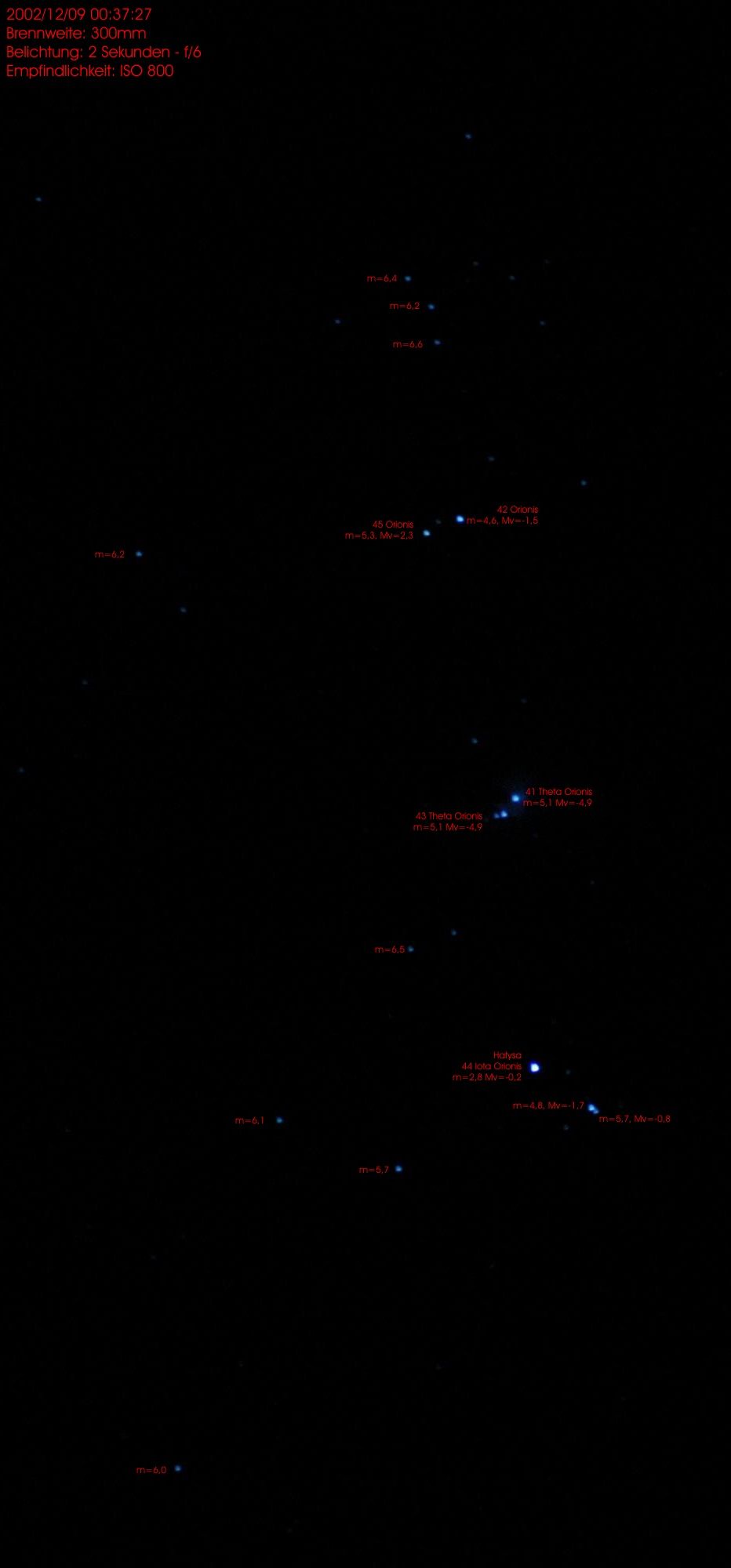 Auf Grund der enormen Breite dieses Bildes war ich außerdem gezwungen, das Format dieser Seite ein wenig anzupassen. Wenn Sie sich also wundern, wieso das Bild erst [ganz da unten] kommt, dann liegt das einfach nur an einem kleinen HTML-Problem. Klicken Sie auf die einzelnen Sterne, um eine genauere Ansicht zu bekommen. Manche Browser unterstützen keine <map>-Tags, deswegen hier auch alle Bilder zum so anklicken: [Alpha Orionis] (Betelgueze, links oben), 71kb [Delta, Epsilon und Zeta Orionis] (Mintaka, Alnilam und Alnitak, mitte, der "Gürtel des Orion"), 208kb [Gamma Orions] (Bellatrix, oben mittig), 83kb [Iota und Theta Orionis] (Hatysa, mitte unten), 74kb [Iota und Theta Orionis] (Weißabglich auf 3000°K => das Bild erscheint blauer), 40kb Von den unteren beiden Sternen (Beta=Rigel und Kappa=Saiph) habe ich zwar auch Nahaufnahmen, aber ich weiß leider nicht mehr, welches Bild welchen Stern zeigt... Asche auf mein Haupt. Bei [diesem hier] (174kb) bin ich mir relativ sicher, daß es [Rigel] ist, was dann wohl heißt, daß [das hier] (186kb) [Saiph] ist. Eine genaue Beschreibung des Sternbildes kann man unter http://www.astronomie.de/ |