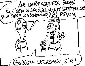 Kirk:" Was sagt er, Spock?" Spock: "Er hat Blähungen von den vielen Calamari!" |