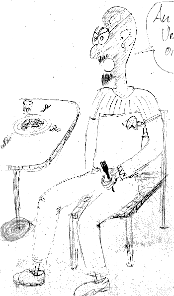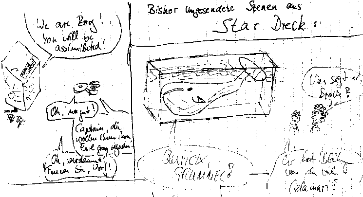 Kirk:" Was sagt er, Spock?" Spock: "Er hat Blähungen von den vielen Calamari!" |